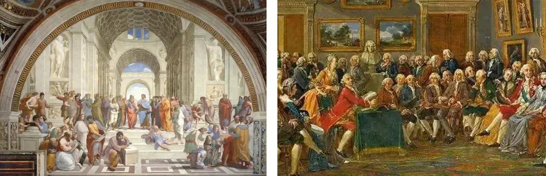 △ 左:《雅典学院》;右:《在若弗兰夫人沙龙里诵读伏尔泰的悲剧〈中国孤儿〉》
