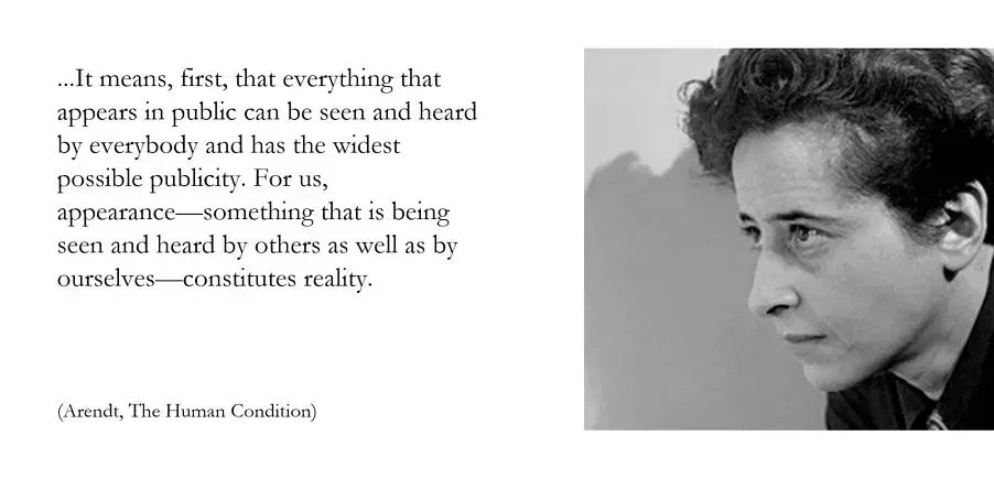汉娜·阿伦特也在《人的境况(The Human Conditions)》中表达了基本相同的意见。正是她在1950年代第一次提出了“公共领域(public realm)”这一概念。阿伦特认为,公共领域既是多样的又是统一的。**人们从不同地方,不同方向对同一位置进行观察,聚集在它周围的人在多样性中看出了统一性。**所以公共领域的现实性依赖于多样与统一的同时存在。另外,真理或许本就是虚无的。在公共领域中,公众应“以意见取代真理,以意见掌握真理”。每个人都以自己的方式理解世界,发表不同的意见,没有人掌握的是绝对的真理。意见相互交流,公众才能对共同的世界有完整更多了解。