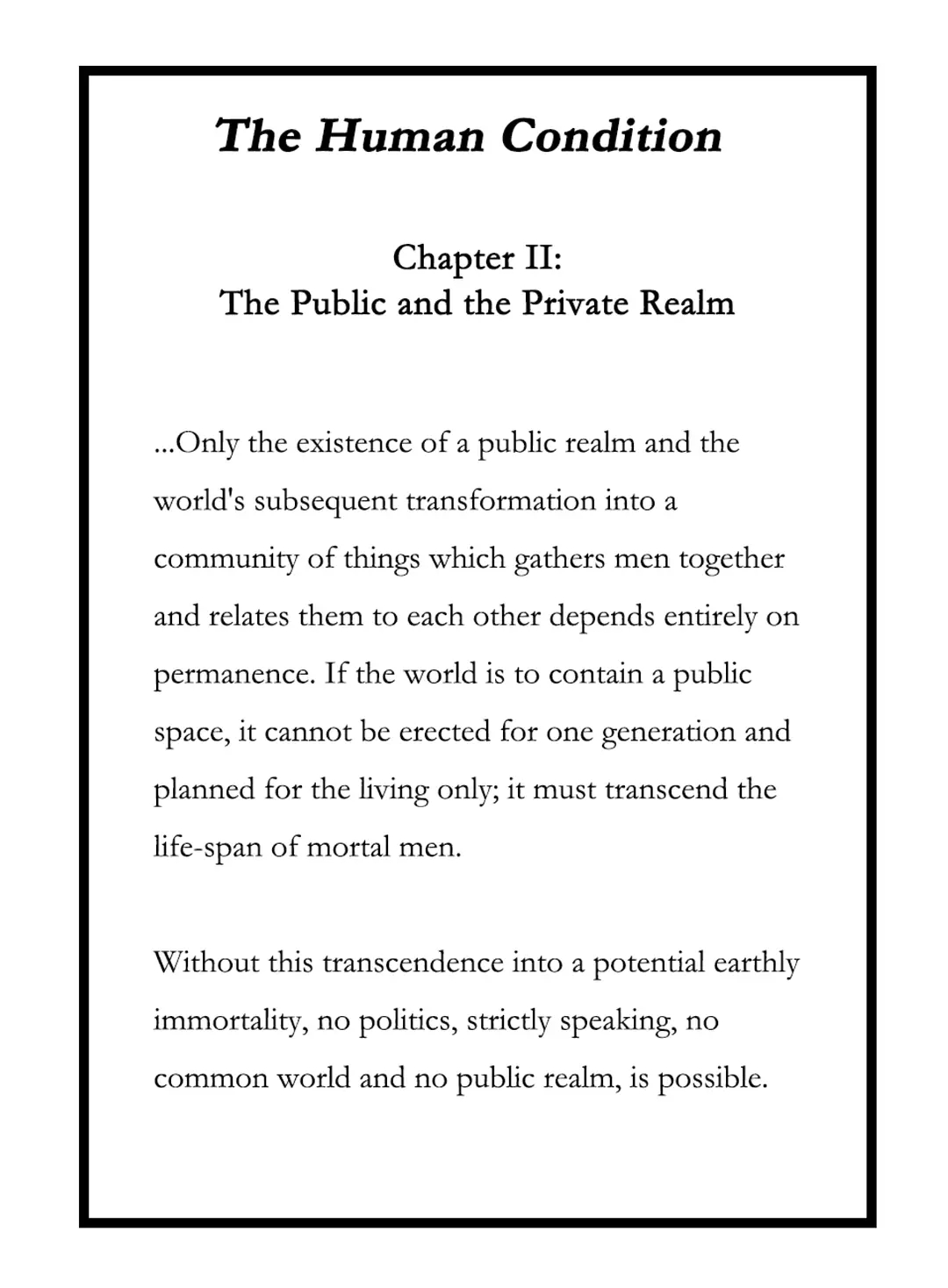 “存储”这一点主要针对于公众讨论的过程以及讨论以后形成的公共意见是否得到了妥善保存。在《人的境况》相应章节的论述中,阿伦特认为公共领域是超越了凡人的有限生命而具有潜在世俗永恒性的领域。它“持续存在”——一代又一代的人们生生灭灭,但发表公共意见的火种永不熄灭,重要的事件也应该被永久储存在公共领域中,作为后来者值得参考的历史材料。