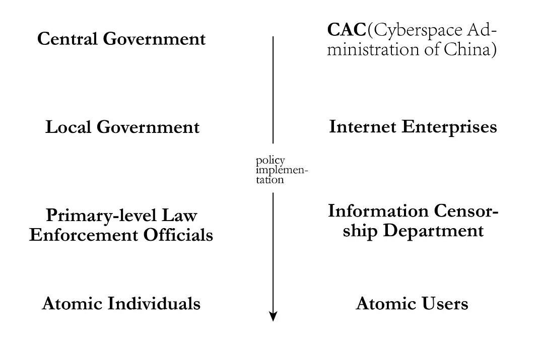 如果我们把视野进一步扩大到更加根本性的结构上,思考运营者为什么需要有意避免向用户提供“讨论”的场所,那么这背后的原因和这个国家几乎所有政策的执行都拥有同样的逻辑。对于一个“从中央到地方”的严格金字塔结构,社交媒体面对的版本即是:从国家互联网信息办公室(“网信办”)到互联网企业内部的网络信息审查部门(从主管到审查员),再到具备广泛影响力的用户(“大V”、“网红”、“POL”),最后是草根用户。政策在虚拟空间中的传达和真实空间并无二致,依旧是强调“领会上级的意图”以及“向上级负责”。所以在效果上,很多时候会表现出从中央到地方层层扩大的反应强度。因为“宁肯执行得过度,也不能执行得不到位”、“表态要充分”。